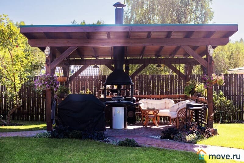 Он покрыт газоном с автополивом, есть зона для барбекю, дорожки из брусчатки, плодовые деревья и декоративные растения.